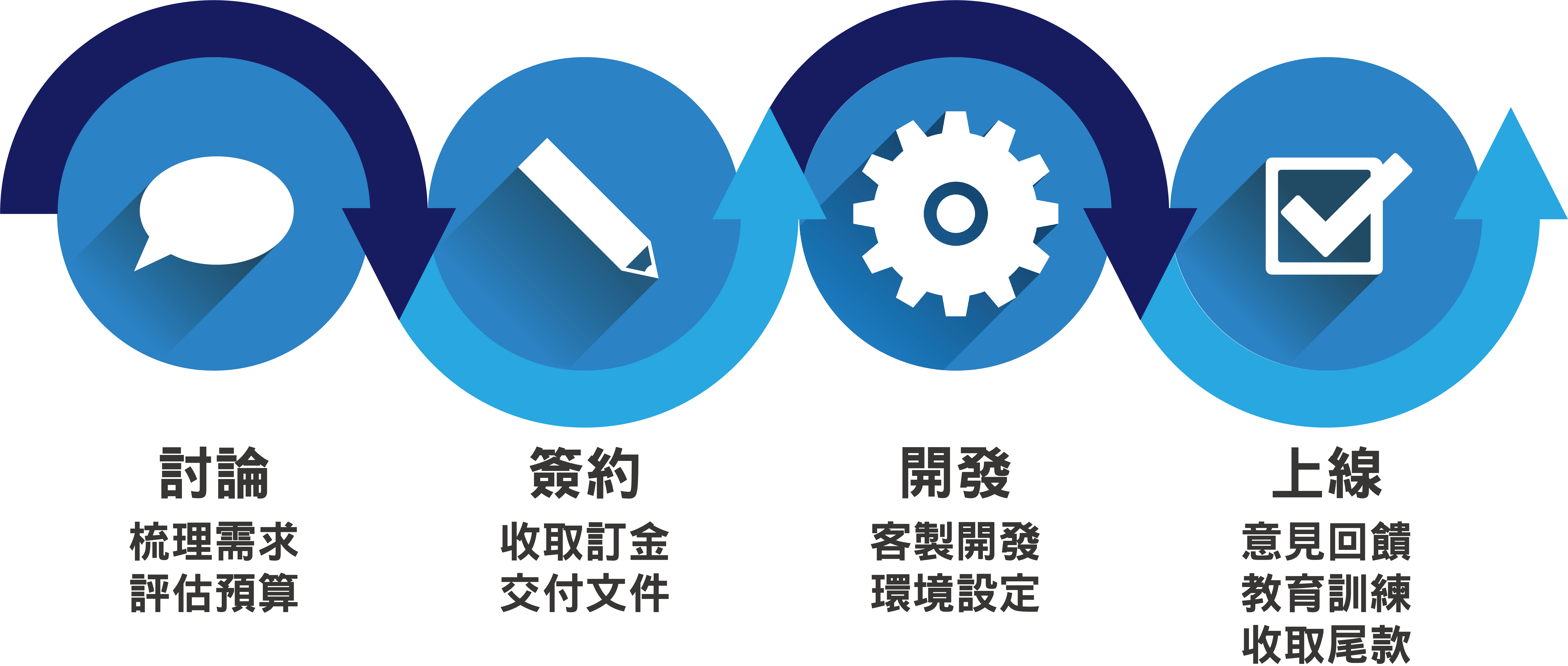 收取訂金後提供文件,確定軟體的開發類型、具體功能、介面設計、風險評估與時程規劃。